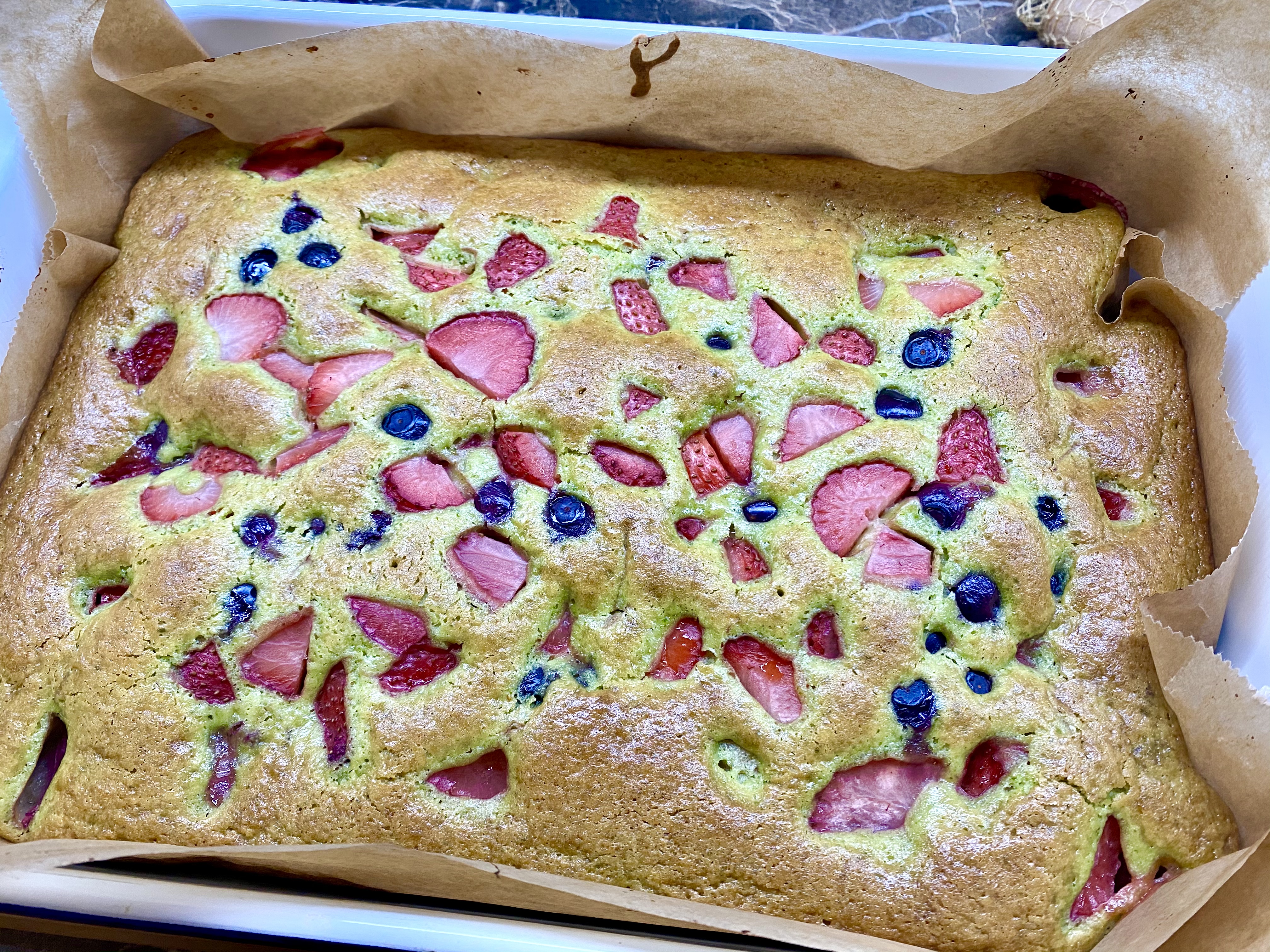 Es ist ein einfacher Blechkuchen geworden mit Rahm und Beeren. Man kann die TK-Beeren zb. darin verarbeiten oder frische nehmen. (Bald gibt es auch schon Erdbeeren aus dem Garten). Der Kuchen ist fluffig und saftig und die grüne Farbe ein Highlight. Obst kann man je nach Saison variieren oder auch ganz weglassen.